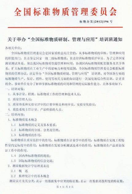 关于举办“全国标准物质研制、管理与应用”培训班的通知