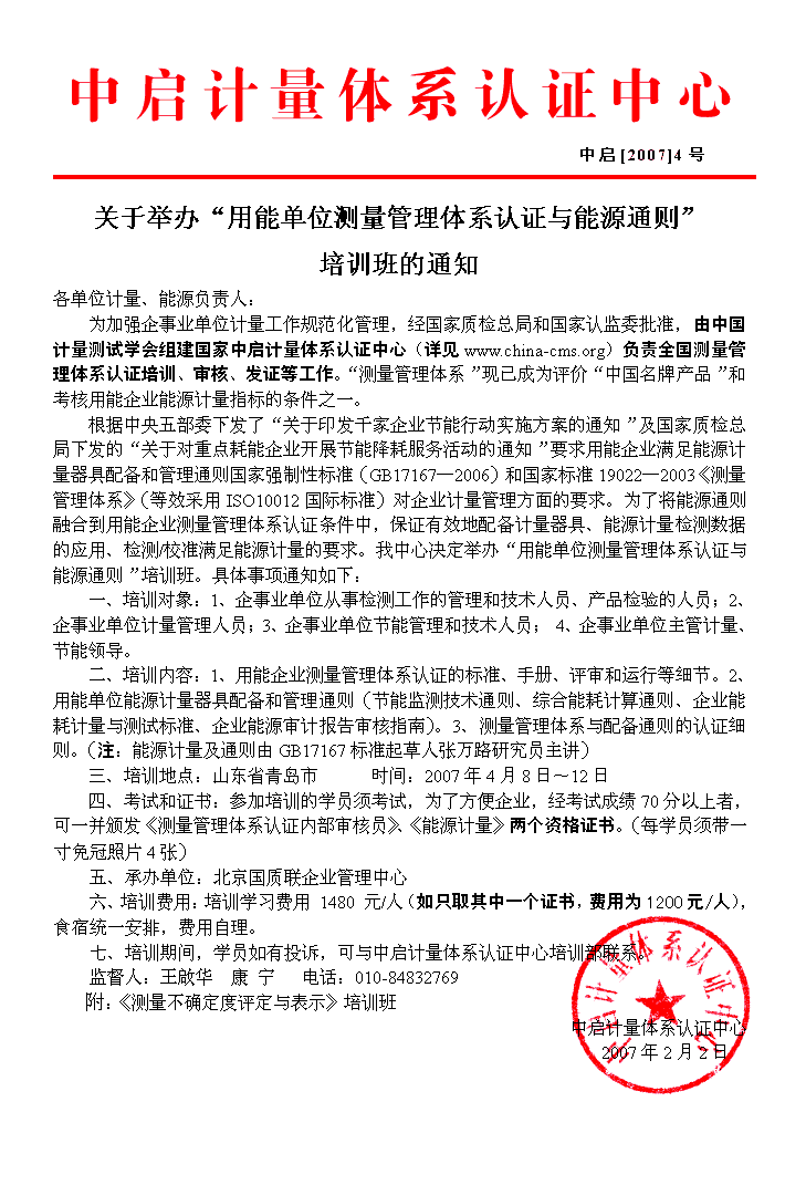 关于举办“用能单位测量管理体系认证与能源通则”培训班的通知