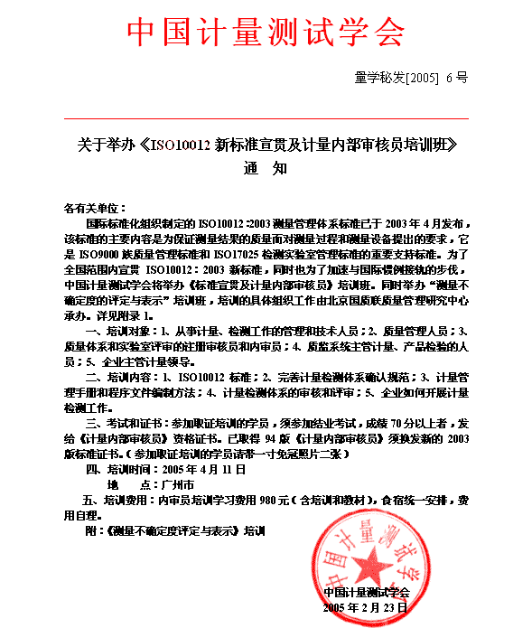 关于举办《ISO10012新标准宣贯及计量内部审核员培训班》通知(2005.04.11 广州)